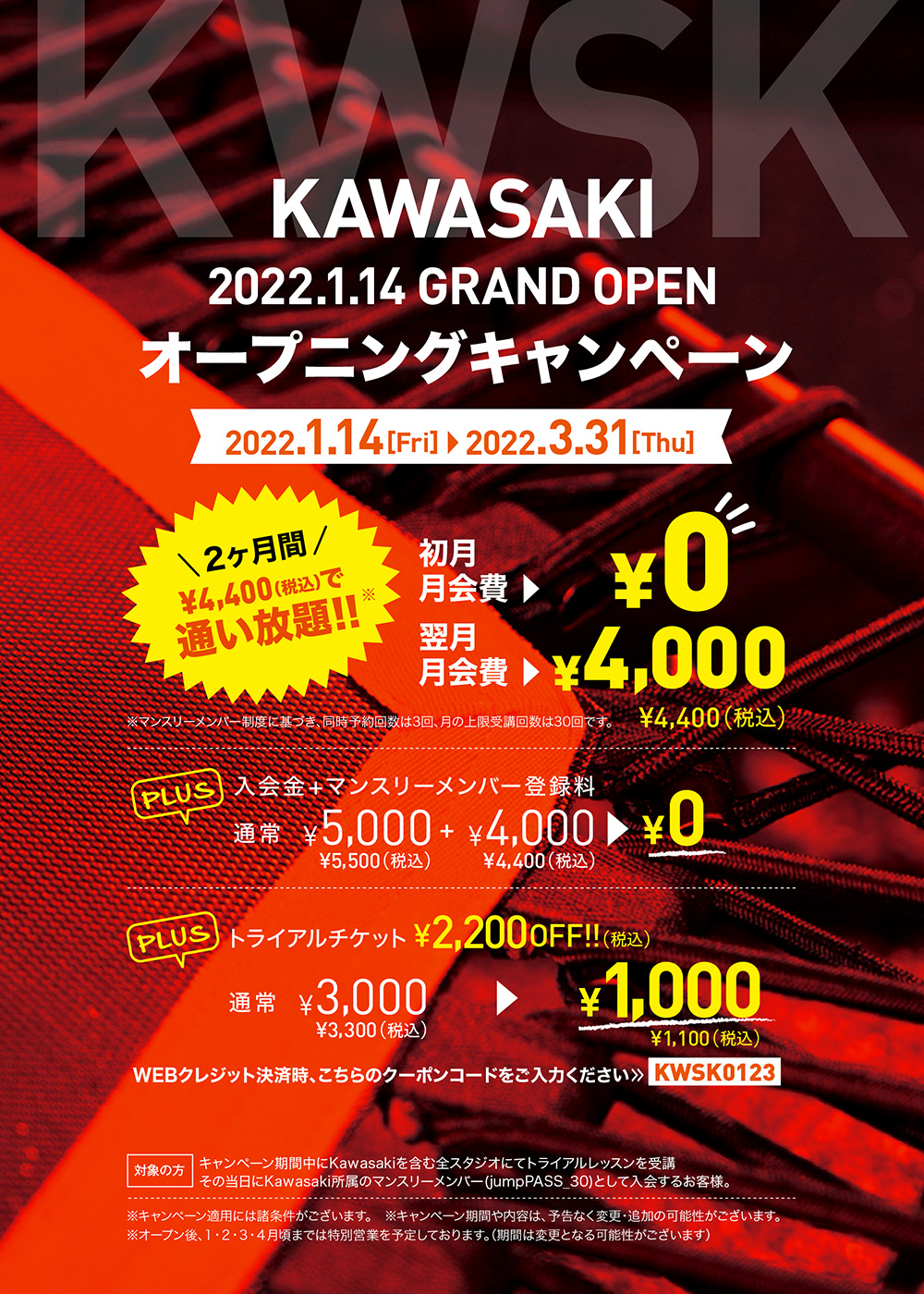 キャンペーン期間中にKawasakiを含む全スタジオにてトライアルレッスンを受講し、その当日に