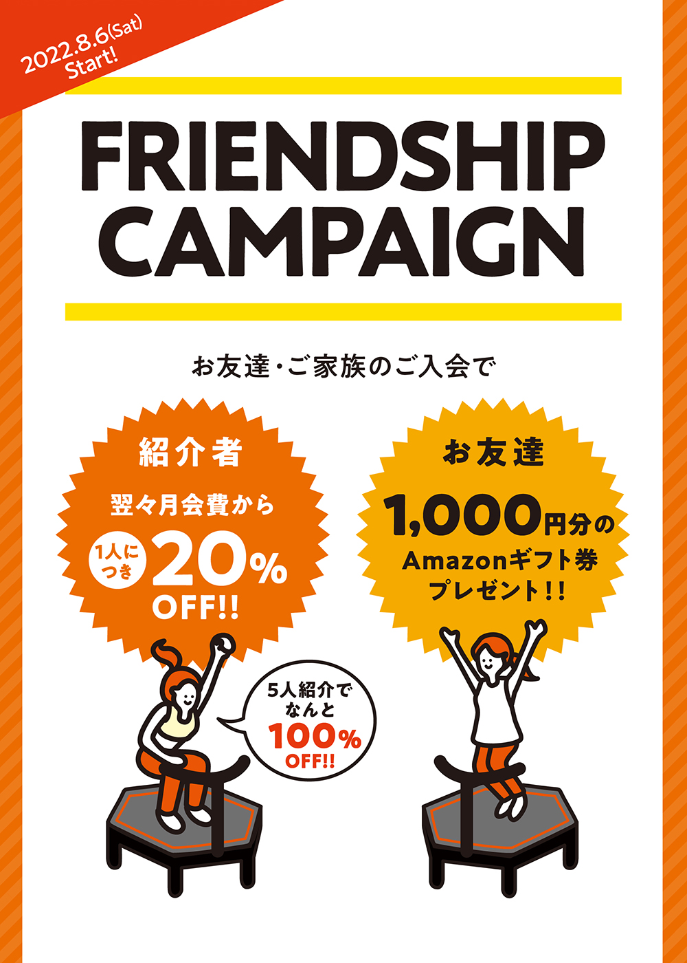 2022.08.05 CAMPAIGN Friendship Campaign!! 2022/8/6(Sat)より jump one 全店で『Friendship Campaign』を実施いたします! お友達と一緒なら きっともっと楽しい! この夏、お友達やご家族と一緒に“jump one”で楽しく身体を動かしてみませんか? Friendship Campaignの詳細はこちらから