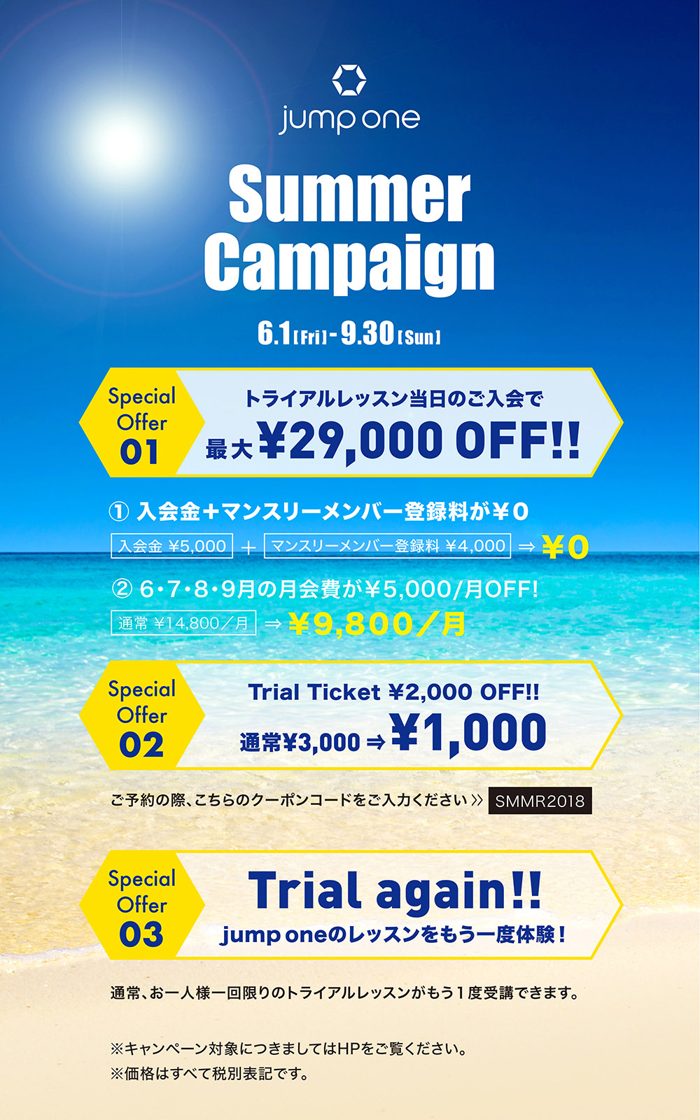 対象の方:期間中、各スタジオにてトライアルレッスンを受講して頂き、その当日にマンスリーメンバー(jumpPASS_30)に入会されたお客様。