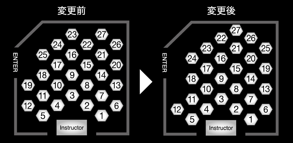 なお、7月5日(水)の変更以前に7月6日(木)~7月11日(火)のレッスンをご予約の場合、予約時と受講時のトランポリンレイアウトが異なります。